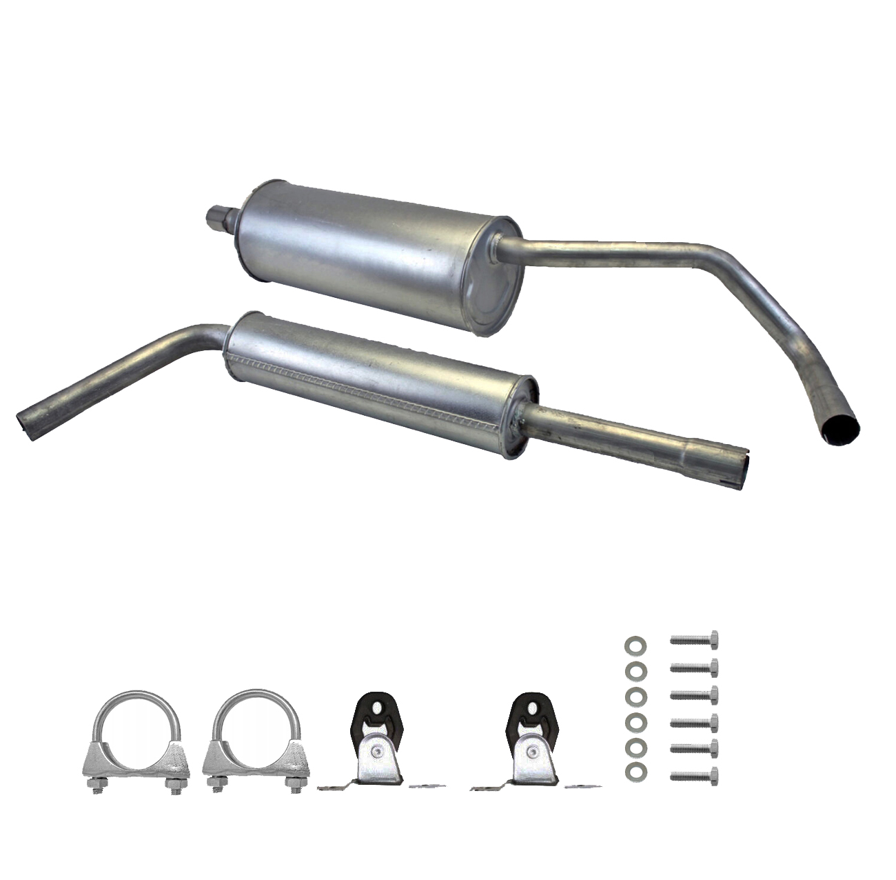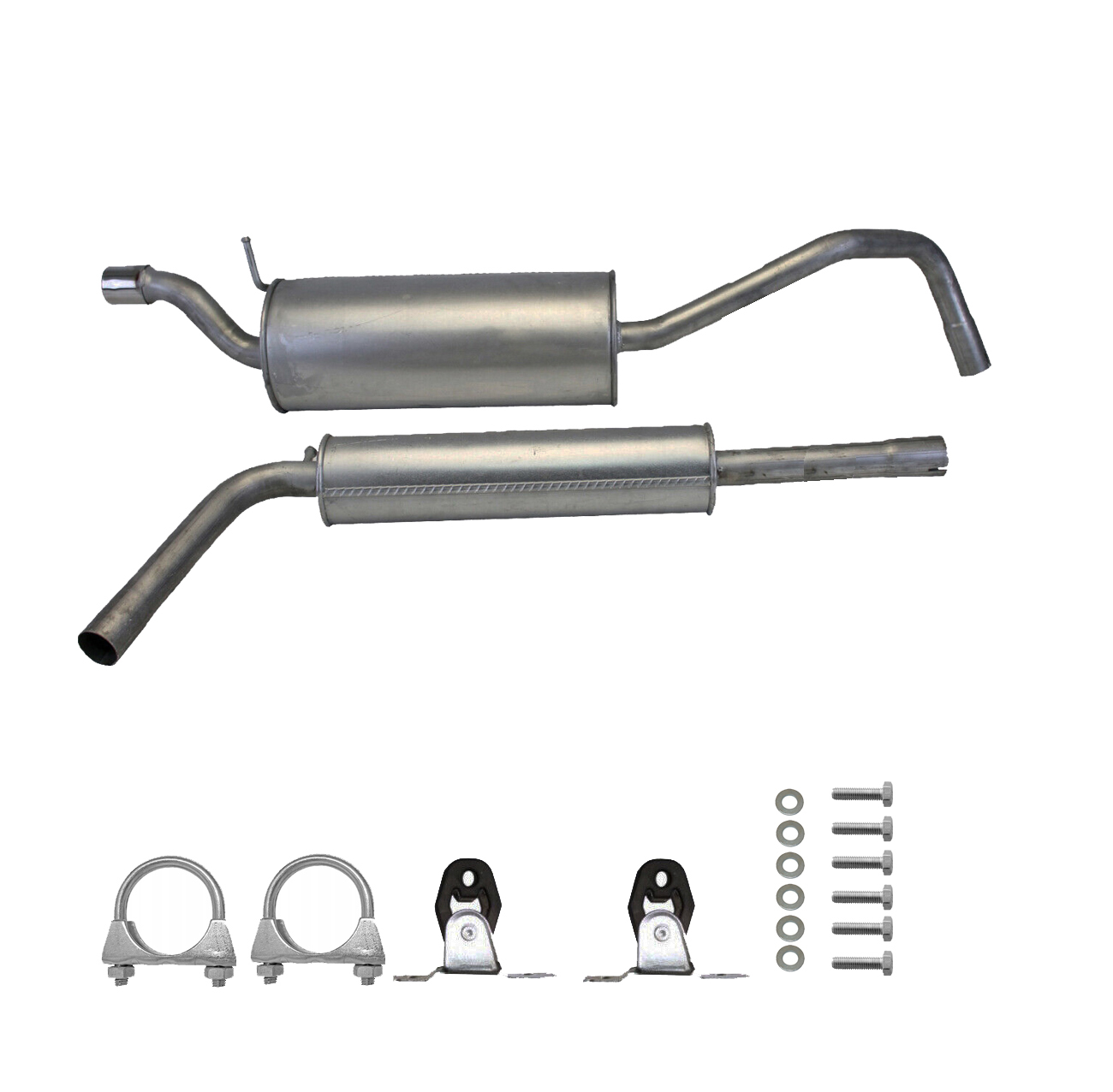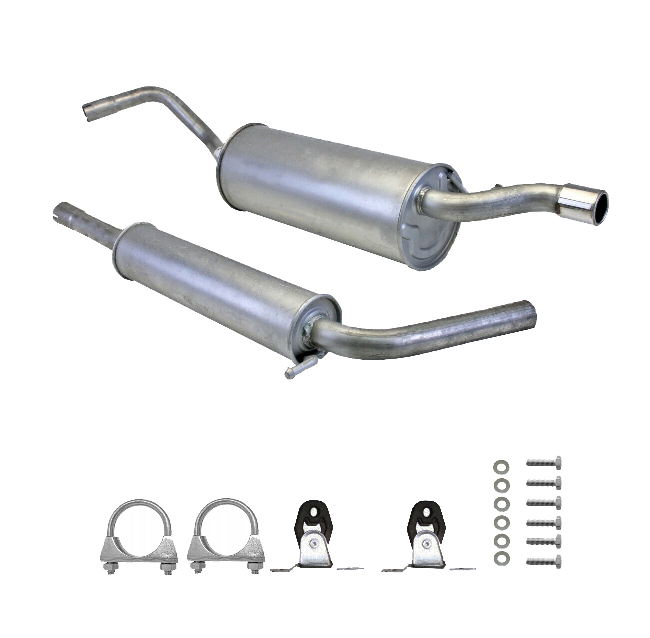 * Tłumiki posiadają system wygłuszający na bazie włókna szklanego dzięki temu nie zmienia się głośność układu wydechowego. * Produkt nie wymaga spawania !